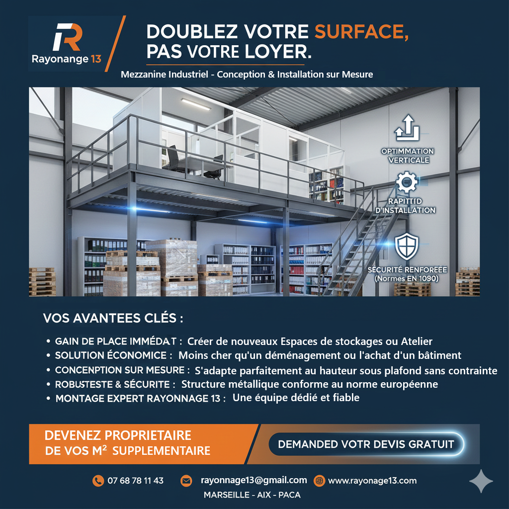 Doublez votre surface de stockage avec nos mezzanines industrielles sur-mesure dans le 13. Étude, pose conforme aux normes ERP/ERT et devis sous 48h.